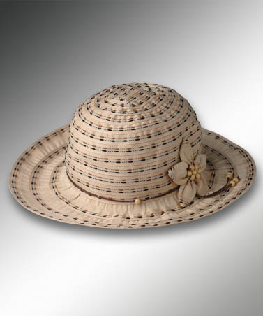 Striped cotton hat with floral trim , packable available in natural and black/ white colours AHA 90 1029 Retail $28.00